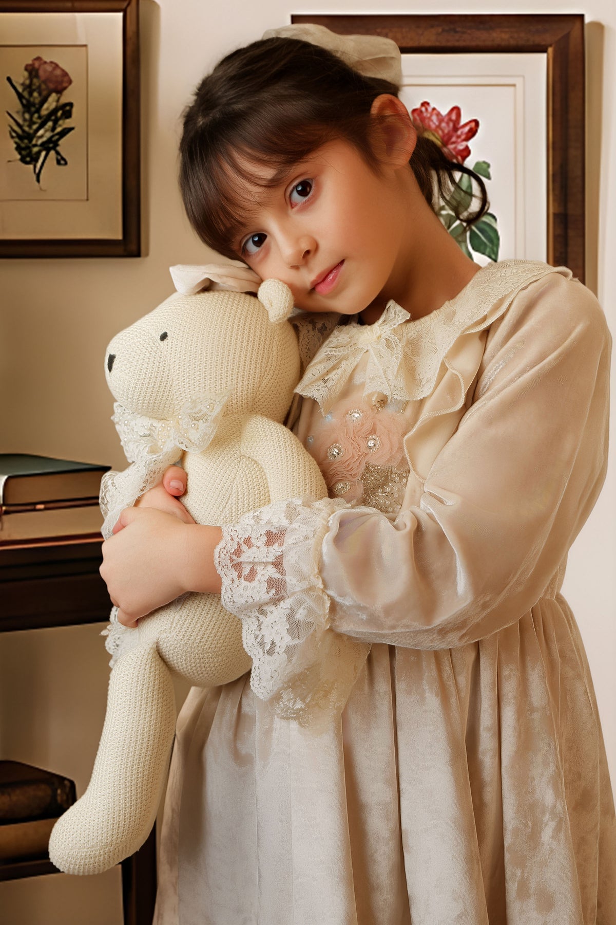 Introducing Teddy Tales & Childhood Trails a winter edit born from slow mornings, muddy shoes, warm hugs, and the quiet magic of growing up. Inspired by the simple joys of childhood, this collection feels like a walk down familiar paths holding your favourite teddy close, chasing stories only little hearts believe in, and finding comfort in every layer you wear. Soft velvets, cozy textures, and winter-ready fabrics wrap each piece in warmth, while thoughtful details add a touch of charm without taking away from the innocence.